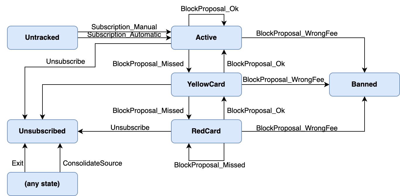 - Finite State Machines illustrating the validator lifecycle (states and triggering events).